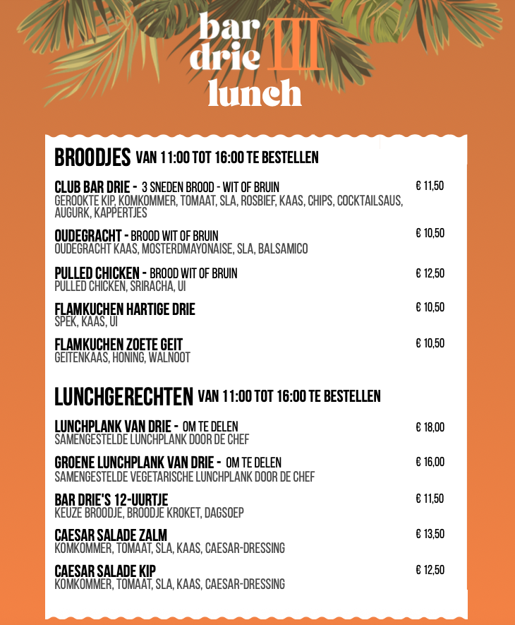 Bar Drie is een warme, hippe, bruisende ontmoetingsplek voor koffiedates, ontbijters, theeleuten, lunchlovers, fijnproevers, borrelaars, bierdrinkers, wijnliefhebbers en dansfanaten.